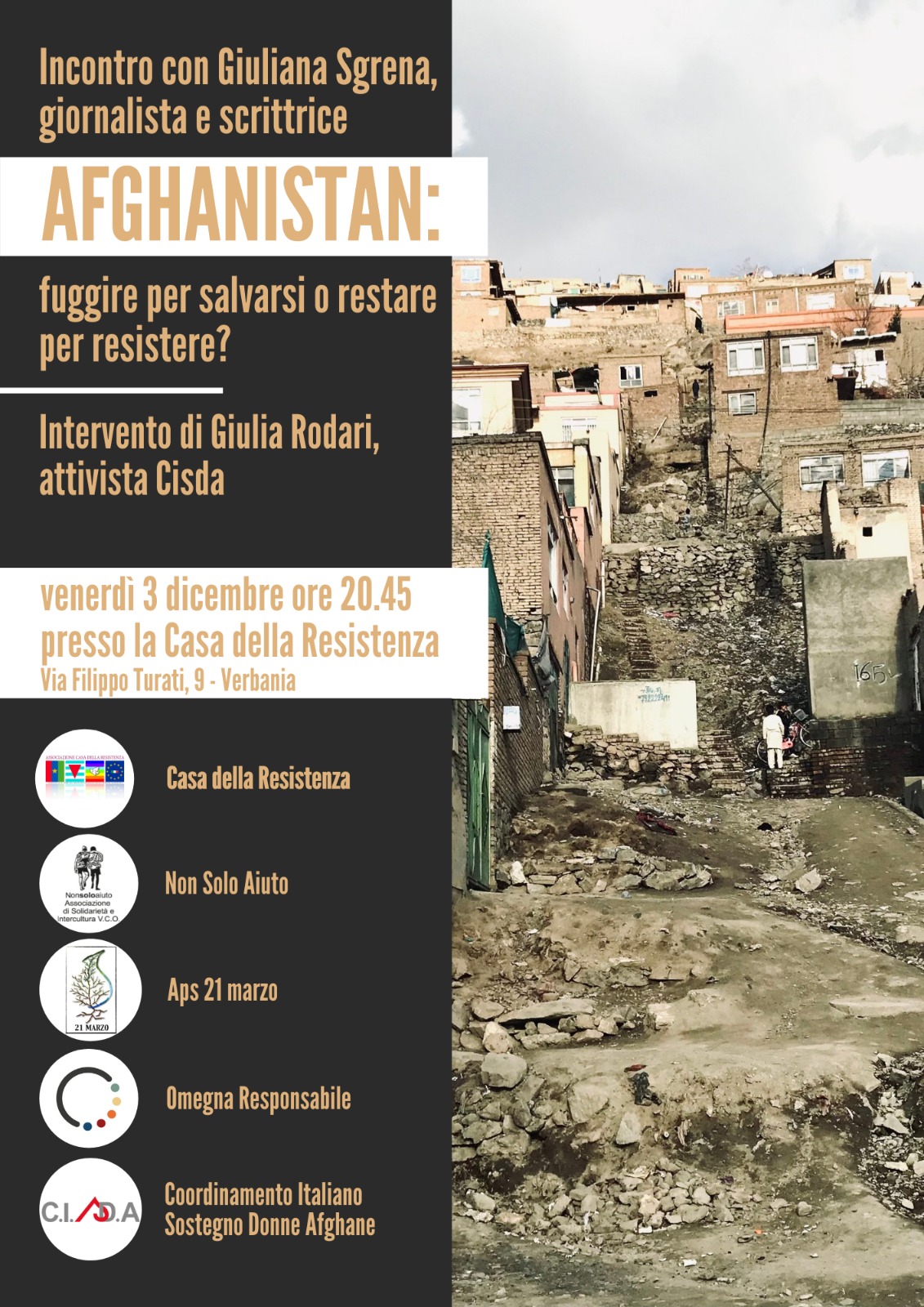 Venerdì 3 dicembre, alle ore 20.45, presso la Casa della Resistenza (via Turati 9, Verbania Fondotoce) si terrà l'incontro "AFGHANISTAN: fuggire per salvarsi o restare per resistere?" Interverranno Giuliana Sgrena, giornalista e scrittrice, e Giulia Rodari, attivista Cisda. Ricordiamo a tutti che, per accedere alla struttura, è necessario essere in possesso di regolare Green Pass, digitale o cartaceo.