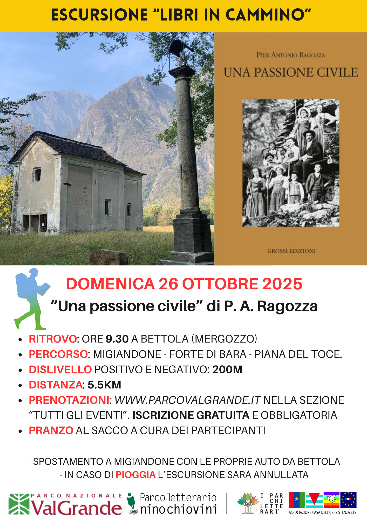 - Domenica 26 ottobre, dalle ore 9:30 (Bettola, Mergozzo-Migiandone, Ornavasso): “Una passione civile". Tra natura e storia un'escursione sulle tracce degli scritti di Pier Antonio Ragozza contenuti nel libro Una passione civile, a cura di Paolo Crosa Lenz e Andrea Pozzetta, Grossi, 2025.