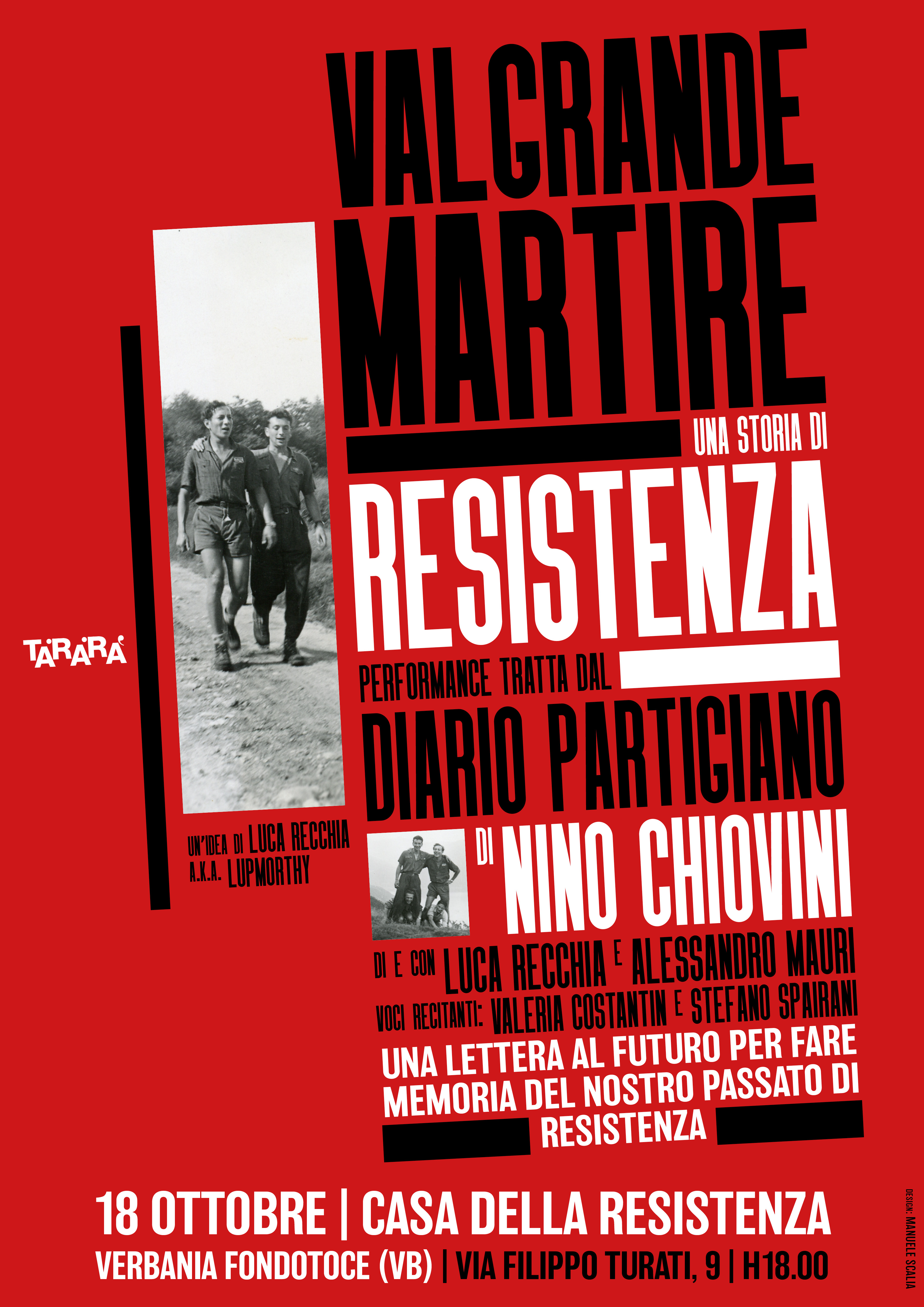 - Sabato 18 ottobre, ore 18 (Casa della Resistenza): Valgrande Martire - Una storia di Resistenza. Performance tratta dagli scritti di Nino Chiovini, reinterpretati per diventare una lettera al futuro.