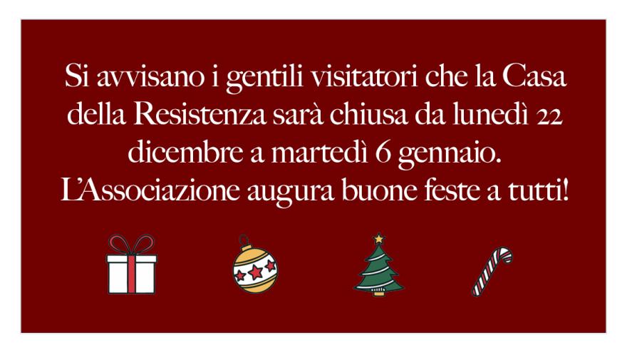 Si avvisano i gentili visitatori che la Casa della Resistenza sarà chiusa da lunedì 22 dicembre a martedì 6 gennaio 2026. L'Associazione augura buone feste a tutti!