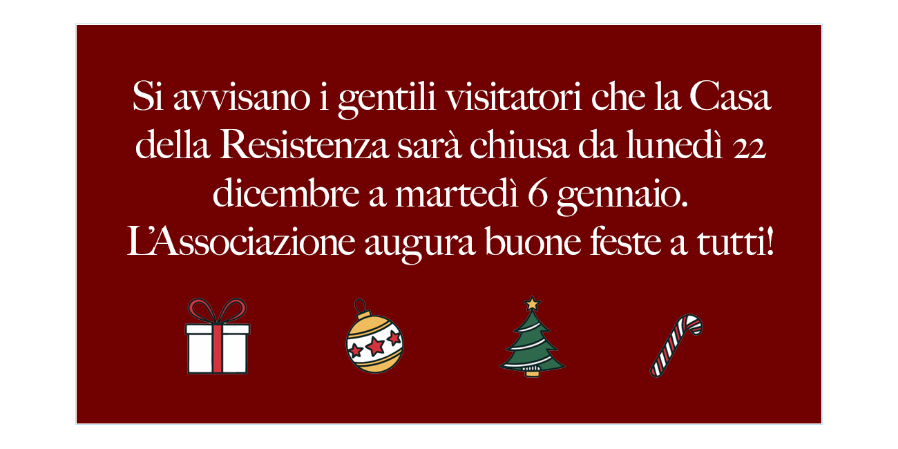 Si avvisano i gentili visitatori che la Casa della Resistenza sarà chiusa da lunedì 22 dicembre a martedì 6 gennaio 2026. L'Associazione augura buone feste a tutti!