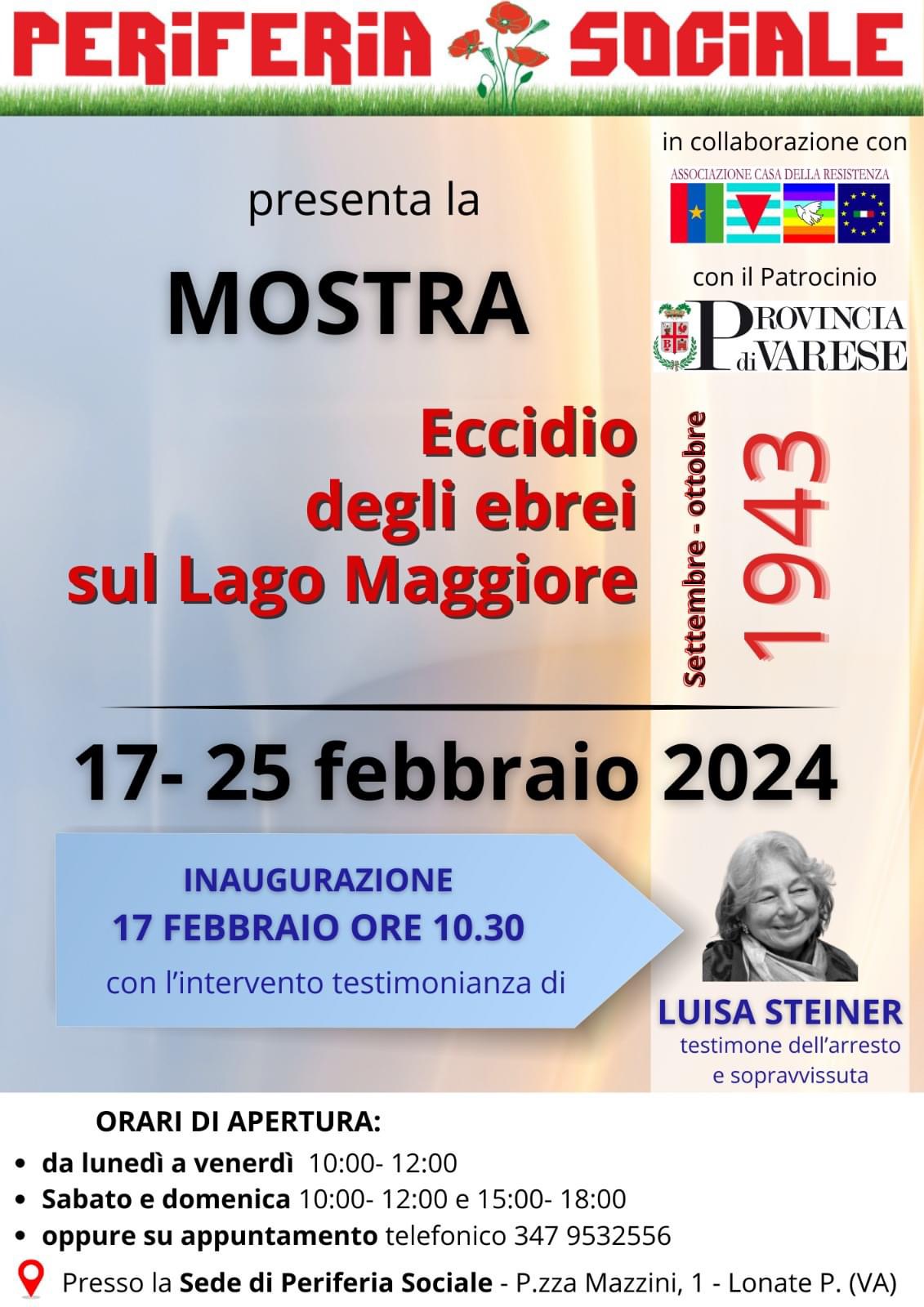Sabato 17 febbraio presso la Sede di Periferia Sociale - P.zza Mazzini, 1 Lonate Pozzolo (VA), in collaborazione con la Casa della Resistenza e il patrocinio della provincia di Varese, ci sarà l'inaugurazione della mostra "Eccidio degli ebrei sul Lago Maggiore".