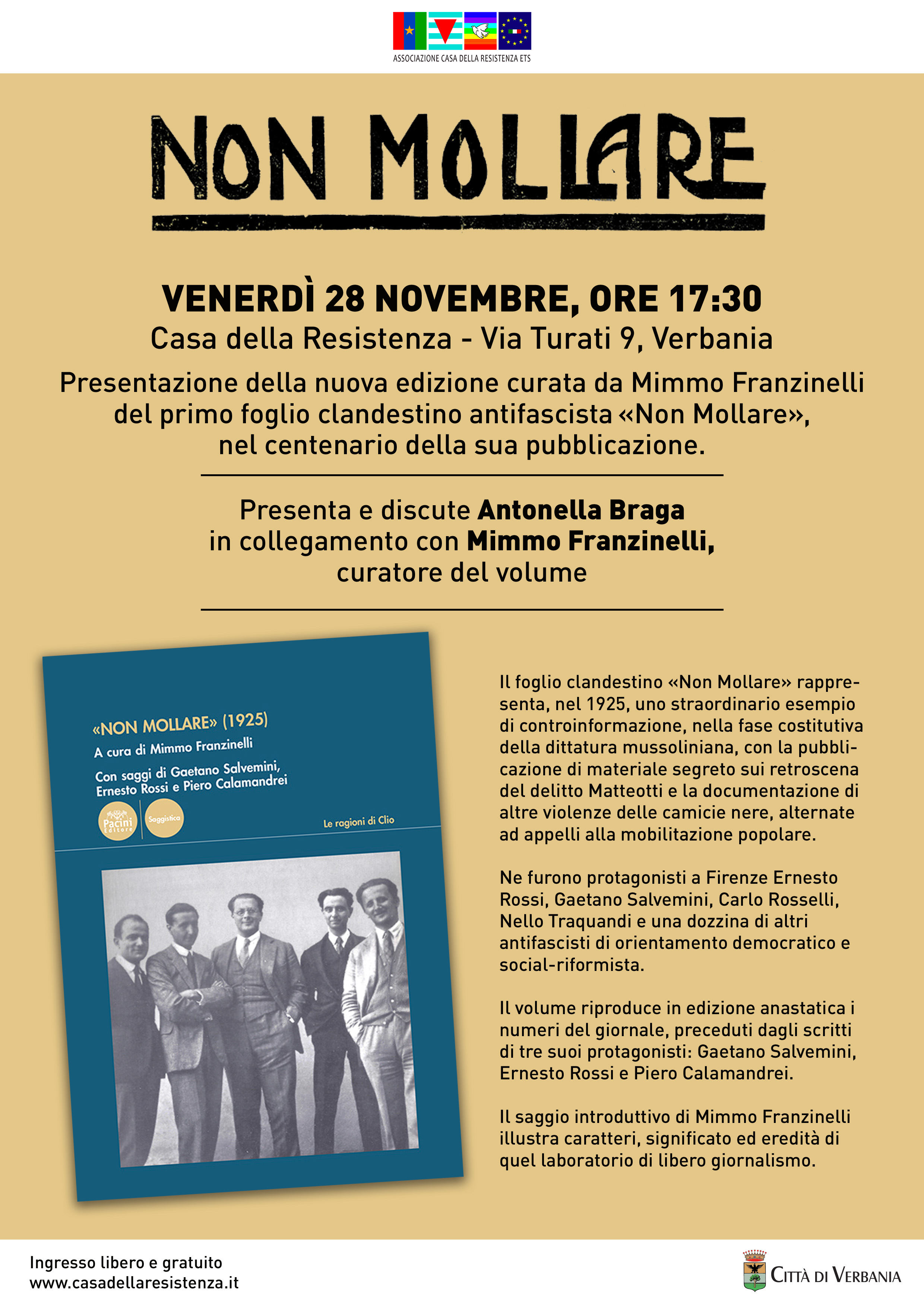 Venerdì 28 novembre alle ore 17:30 presenteramo la nuova edizione curata di Mimmo Franzinelli del primo foglio clandestino antifascista «Non Mollare» (1925) nel centenario della sua nascita e ripubblicato nel 2025 da Pacini Editore. Presenta e discute Antonella Braga in collegamento con Mimmo Franzinelli, curatore del volume.