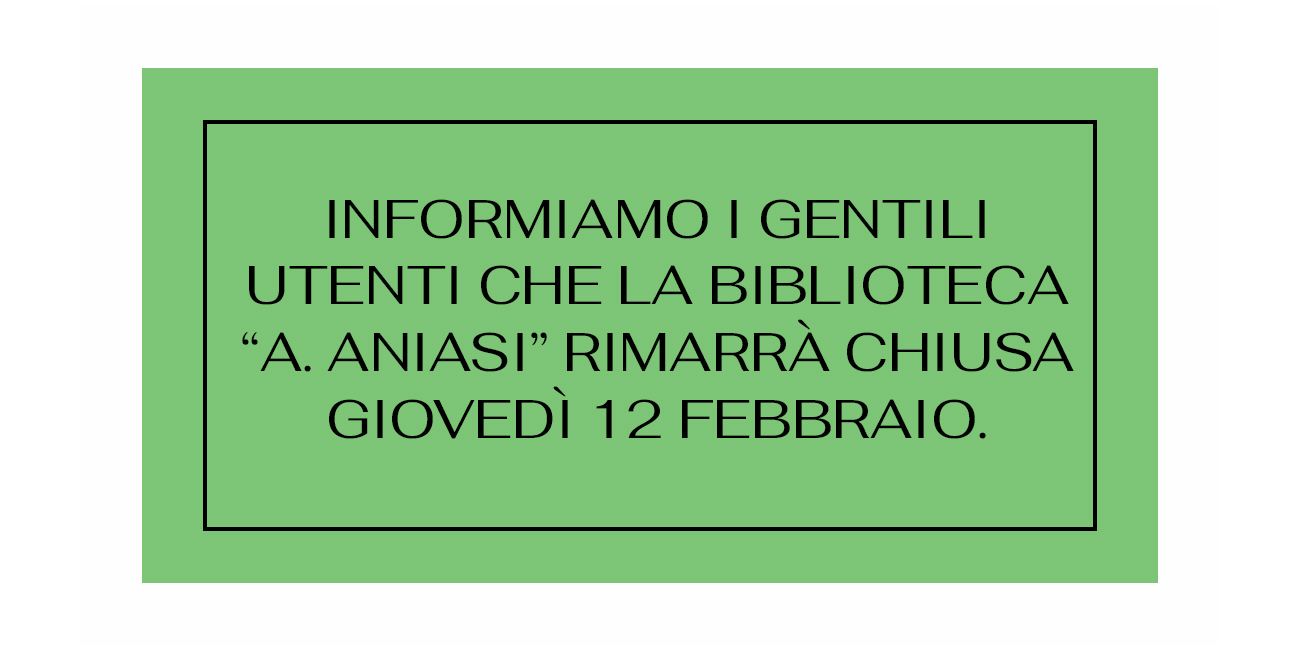 Informiamo i gentili utenti che la biblioteca "Aldo Aniasi" rimarrà chiusa in data giovedì 12 febbraio dalle ore 9:00 alle ore 17:30.